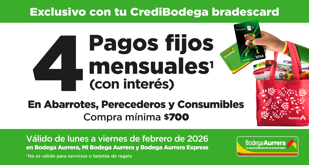 ¹Promoción válida todos los lunes, martes, miércoles, jueves y viernes de febrero (02 al 06 de febrero, 09 al 13 de febrero, 16 al 20 de febrero y del 23 al 27 de febrero del 2026) al comprar en tiendas físicas de Bodega Aurrera, Mi Bodega Aurrera y Bodega Aurrera Express. Compra mínima para 4 pagos fijos (con interés) $700 en abarrotes, perecederos y consumibles en tienda Bodega Aurrera. No es válido para servicios o tarjetas de regalo. Consulta departamentos participantes términos y condiciones en Servicios al Cliente. Tarjeta bradescard Bodega Aurrera internacional. CAT PROMEDIO 73% SIN IVA. Informativo. Tasa de interés promedio ponderada por saldo en términos anuales 46.17% variable. Comisión mensual de $65 Sin IVA. Calculado a agosto de 2025. Tarjeta CrediBodega bradescard. CAT PROMEDIO 77.30% SIN IVA. Informativo. Tasa de interés promedio ponderada por saldo en términos anuales 54.09%, variable. Comisión mensual de $29.90 Sin IVA. Calculado a agosto de 2025. Todas las cantidades están expresadas en pesos mexicanos. Tarjetas emitidas y operadas por Bradescard México S. de R.L. Consulta Términos y comisiones en www.bradescard.com.mx