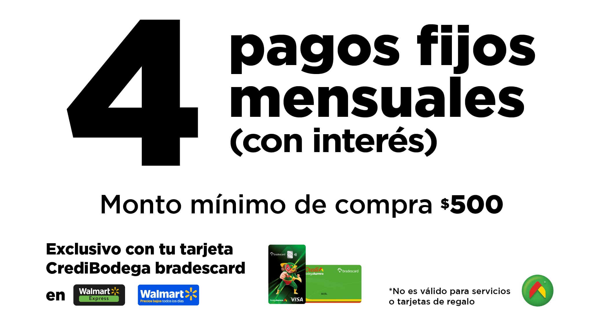 Promoción válida del 01 al 30 de abril de 2026 en tiendas físicas Walmart Express y Walmart. Compra mínima para 4 pagos fijos (con interés) $500 en los siguientes departamentos: Accesorios para Baño, Artículos de Fiesta, Autos, Blancos, Cortinas, Deportes, Ferretería, Hogar, Jardinería, Libros y Revistas, Papelería, Pinturas, Plantas, Prichos y Temporada. No es válido para servicios o tarjetas de regalo. Consulta departamentos participantes términos y condiciones en Servicios al Cliente.Tarjeta bradescard Bodega Aurrera internacional. CAT PROMEDIO 71.50% SIN IVA. Informativo. Tasa de interés promedio ponderada por saldo en términos anuales 44.77% variable. Comisión mensual de $69 Sin IVA. Calculado a febrero de 2026. Tarjeta CrediBodega bradescard. CAT PROMEDIO 74.80% SIN IVA. Informativo. Tasa de interés promedio ponderada por saldo en términos anuales 52.41%, variable. Comisión mensual de $32 Sin IVA. Calculado a febrero de 2026.Todas las cantidades están expresadas en pesos mexicanos. Tarjetas emitidas y operadas por Bradescard México S. de R.L. Consulta Términos y comisiones en www.bradescard.com.mx