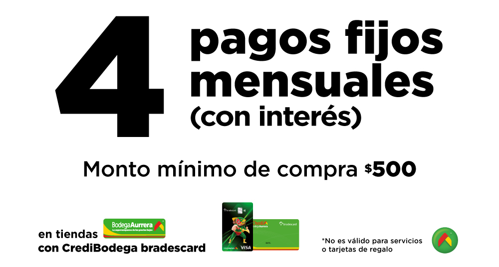 Promoción válida del 03 al 31 de marzo de 2026 en tiendas físicas Bodega, Mi Bodega Aurrera y Bodega Aurrera Express. Compra mínima para 4 pagos fijos (con interés) $500 en los siguientes departamentos: Accesorios para Baño, Artículos de Fiesta, Autos, Blancos, Cortinas, Deportes, Ferretería, Hogar, Jardinería, Libros y Revistas, Papelería, Pinturas, Plantas, Prichos y Temporada. No es válido para servicios o tarjetas de regalo. Consulta departamentos participantes términos y condiciones en Servicios al Cliente. Promoción válida del 12 al 31 de marzo de 2026 en tiendas físicas Bodega, Mi Bodega Aurrera y Bodega Aurrera Express. Compra mínima para 4 pagos fijos (con interés) $500 en abarrotes, perecederos y consumibles. No es válido para servicios o tarjetas de regalo. Consulta departamentos participantes términos y condiciones en Servicios al Cliente. Todas las cantidades están expresadas en pesos mexicanos. Tarjetas emitidas y operadas por Bradescard México S. de R.L. Consulta CAT, Términos y comisiones en www.bradescard.com.mx